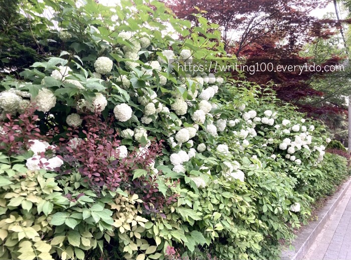 나무위키에 따르면, 수국은 초여름에 꽃이 피고, 처음엔 흰색이었다가 점차 청색이 되고 다시 붉은색이 더해져서 나중엔 보라색이 된다고 한다. 토양의 성분에 따라 색이 달라진단다. 꽃 자체의 색소에 의한 것이 아니기 때문에 고정된 특정색을 원한다면 토양관리를 잘해줘야 한다고 한다. 이런 설명을 읽으니 순간 그동안 봐왔던 다양한 색들의 수국이 떠올랐다.